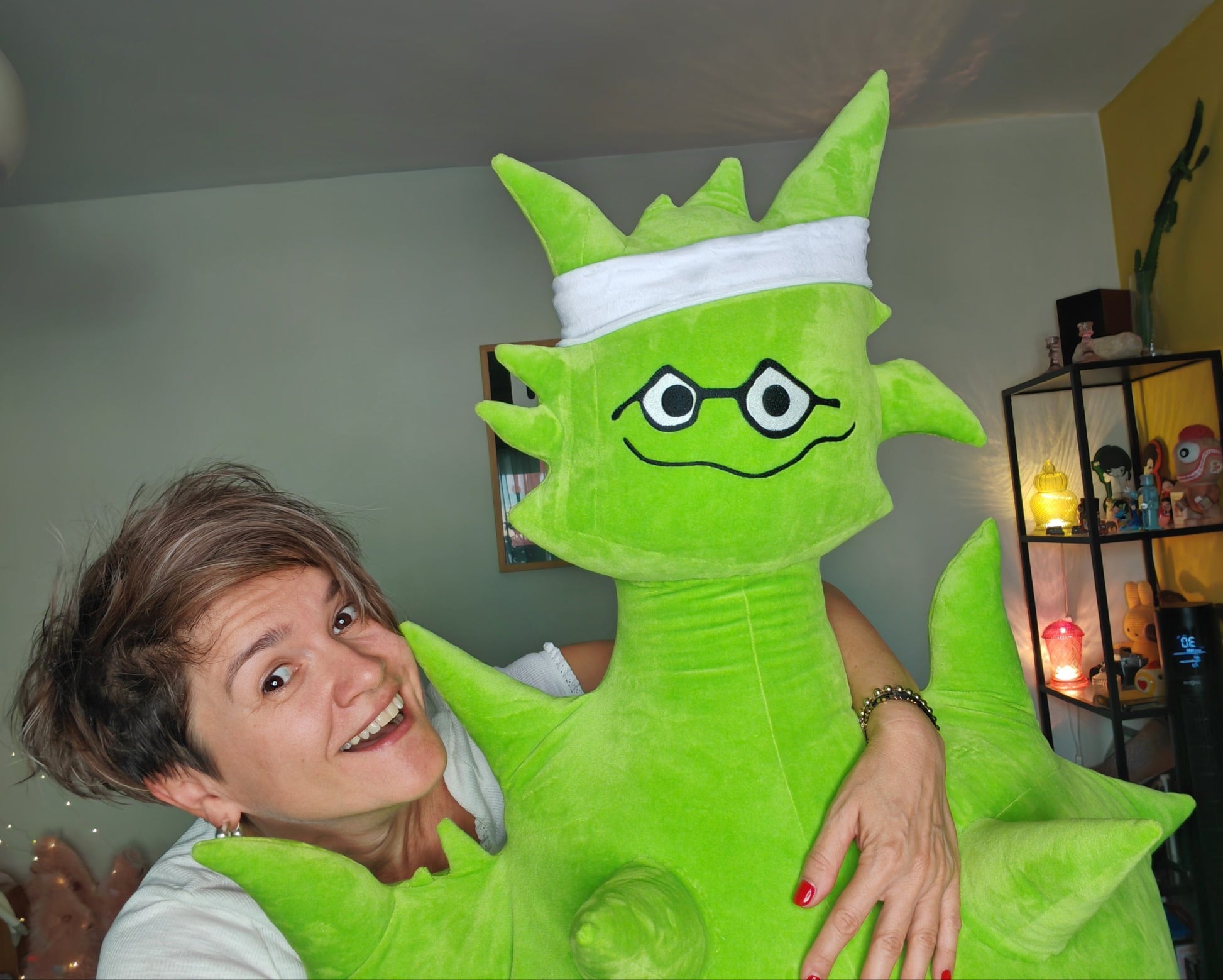 Handcrafted with ultra-soft plush fabric, this giant goofball features embroidered facial details and weighted beads in his bottom to keep him sitting pretty. He’s stuffed with hypoallergenic fiberfill, making him safe for snuggles, squeezes, and spontaneous alien wrestling matches.