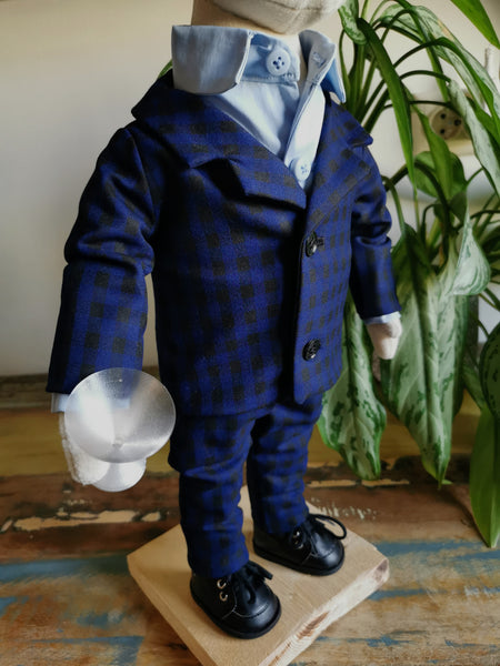 THIS OFFER INCLUDES 1 DOLL of 50 cm with embroidered face details, flexible neck, arms and legs and a clasic suit composed from pants, shirt, jacket and tie.